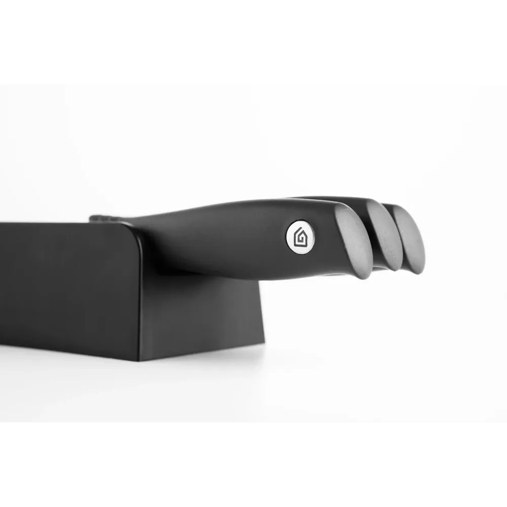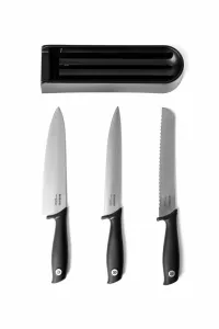 Кожен ніж виготовлений зі загартованої сталі та міцного пластику, що гарантує його тривалу службу та безпеку використання. Гострі леза допоможуть вам швидко та легко нарізати будь-які продукти, а компактний блок для ножів забезпечить їх безпечне зберігання в кухонній шухляді.