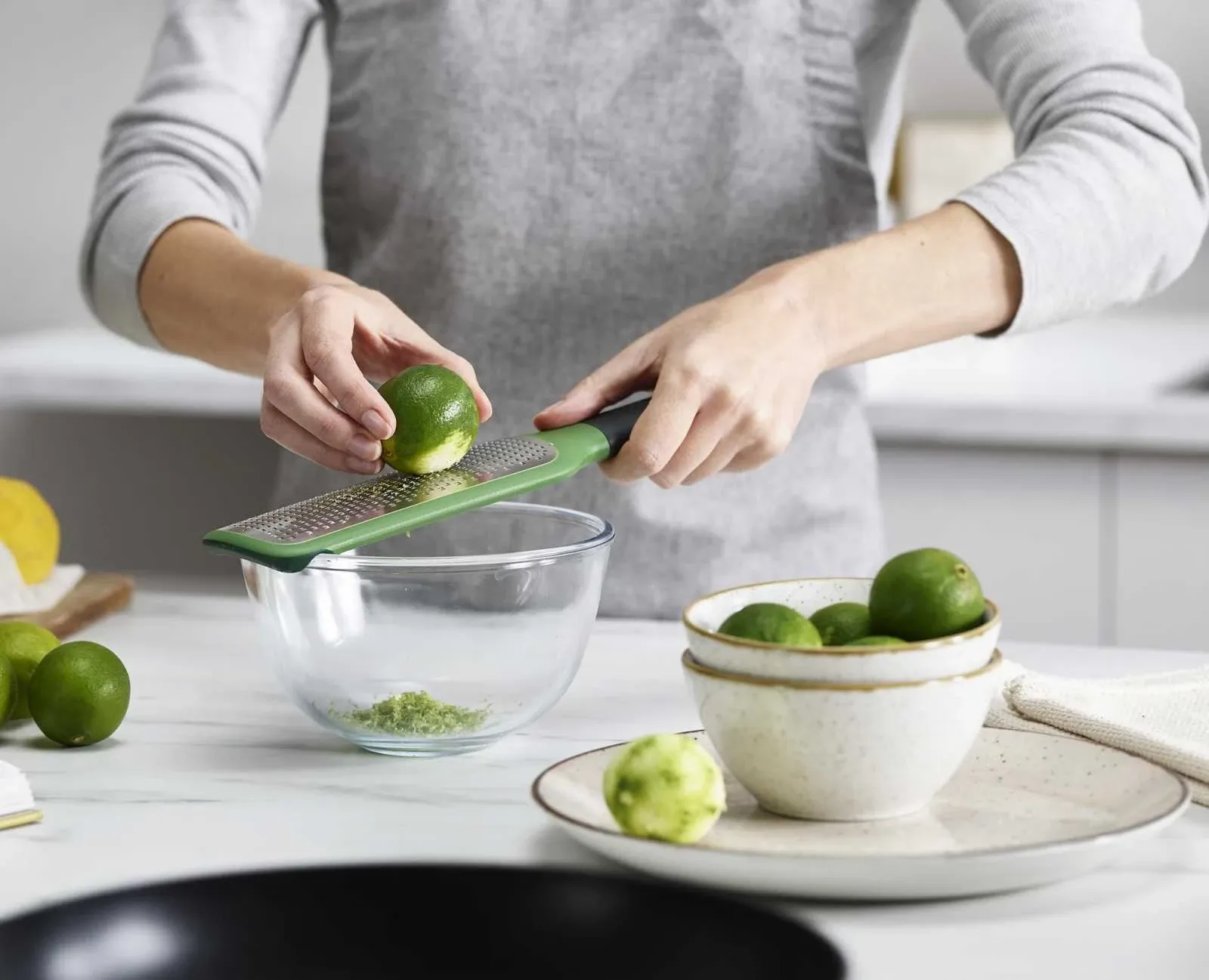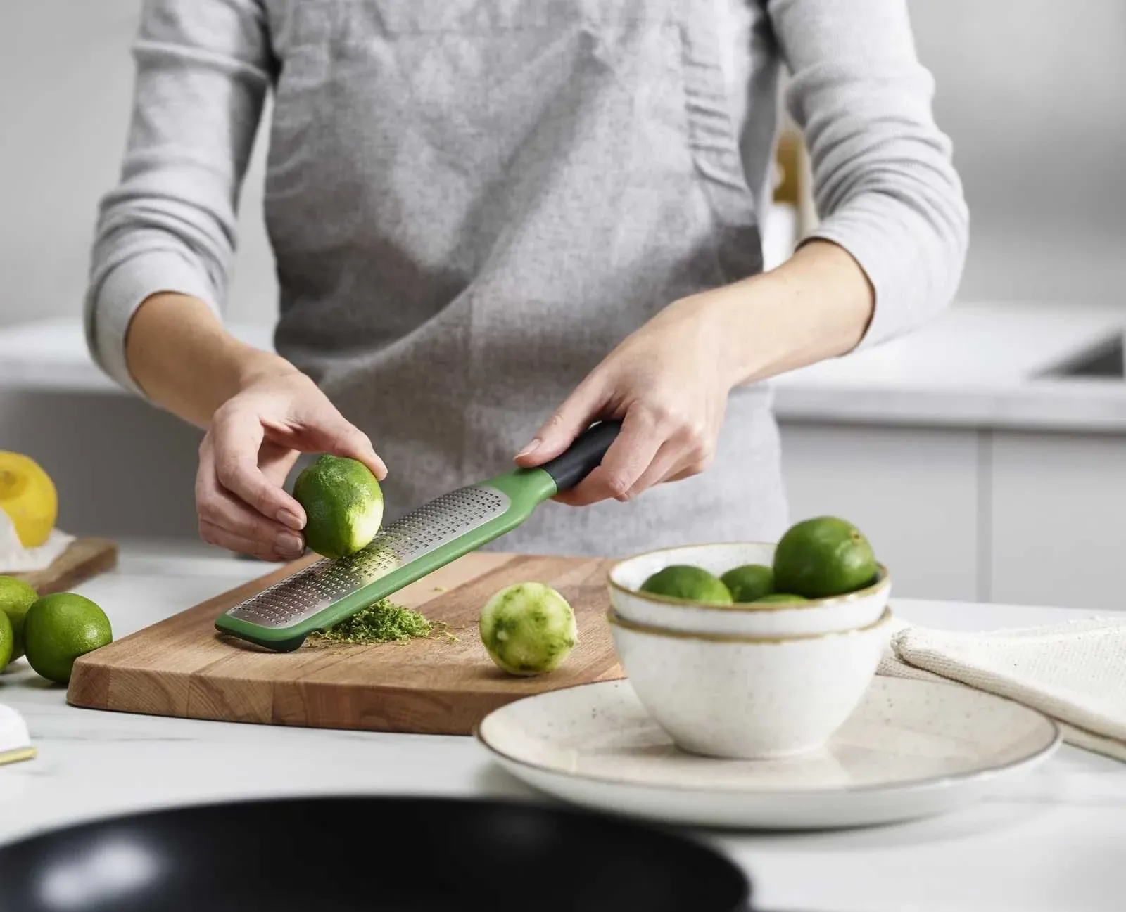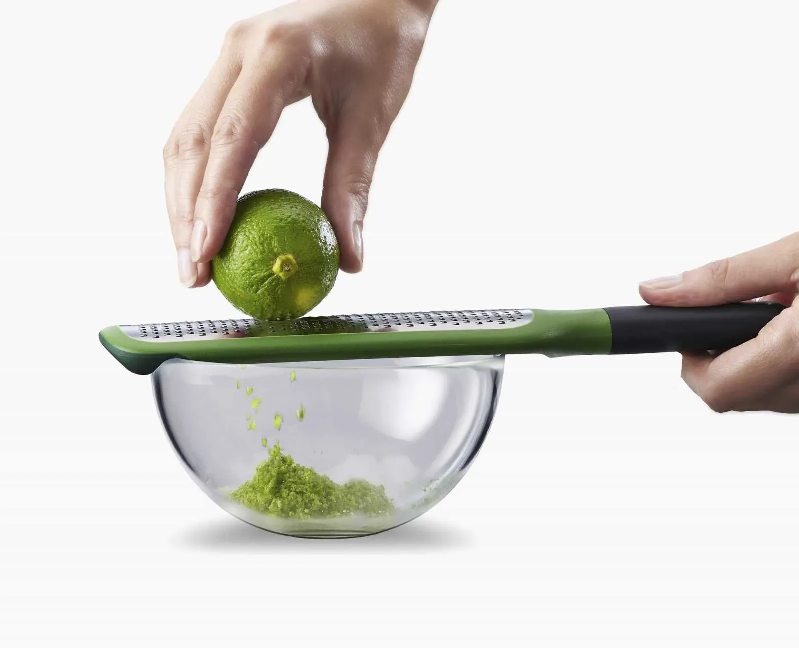 Зелена терка Joseph Joseph GRIPGRATER ідеально підходить для тертя твердих сирів і цитрусової цедри. Вона має зручні виїмки на нижньому боці, які дозволяють зафіксувати тертку на краю миски, щоб зручно використовувати її.